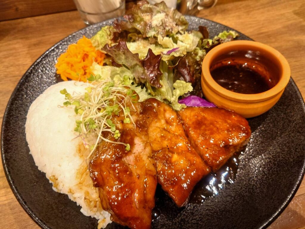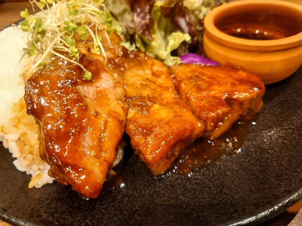 厚み約2cmの豚肩ロース肉は焼き色が香ばしく、噛むとジューシーで食べ応えがあります。ソースは甘辛くコクがあり、肉との相性が抜群でした。ライスも丁度良いボリュームでしっかりいただきました。