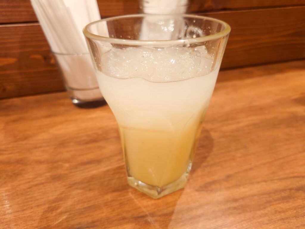 瀬戸田レモネードはほどよい甘さと酸味で、お肉の脂っこさをさっぱりと洗い流してくれます。清涼感たっぷりで、ジューシーなトンテキとの相性も抜群でした。